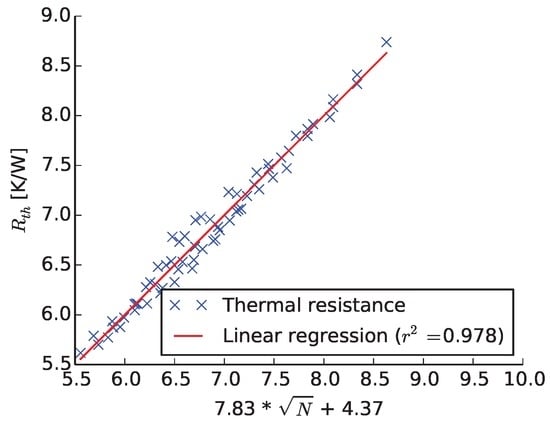 The measurements were used to calculate the thermal resistance, which is presented in Figure 5. The thermal resistance logically increased with the heat source density. For a density above 25%, the thermal resistance doubled. There is no point in continuing the study over this value, as it is unlikely that such a configuration would be chosen in a real case. The rest of the study was therefore restricted to intermediate densities. In this region, the thermal resistance was shown to be proportional to the square root of the heat source density. The linear regression parameters indicated a thermal resistance of approximately 4.7 K/W for an isolated heat source (i.e., zero density, or infinite spacing).