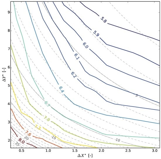 In Method 1, the points on the isolines were obtained by linear interpolation between the two closest measuring points. The isolines for the thermal resistance were fitted numerically according to Equation (8). As such, the parameter c represents the vertical spacing for one single column of heat sources, given a specified thermal resistance. In the same way, b represents the horizontal spacing for a single row of heat sources.