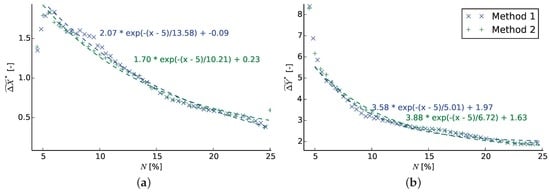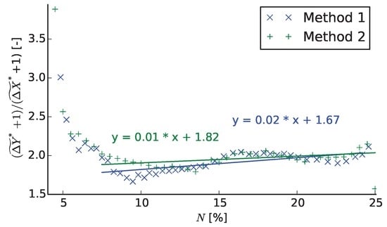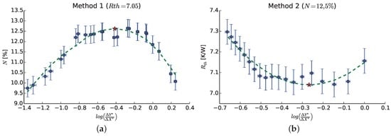 For efficient cooling, the thermal resistances should be kept as low as possible. In order to optimize the distribution, the heat source density, N, was maximized, and the thermal resistance, , was minimized. There are two possible ways to define these optima, and ; see Equation (6) (Method 1) and Equation (7) (Method 2).