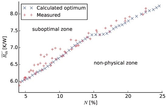 The optimal thermal resistance is dependent on the desired heat source density, and is presented in Figure 8. It increases almost linearly. The changes in the slope for the optimal density—observed at a density of around 15%—are attributed to measurement artefacts, and remain within the confidence interval. The optimal line shown in Figure 8 represents the Pareto Frontier for the multi-objective problem.