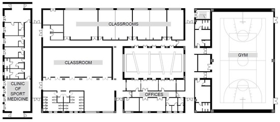 Figure 1). The new building will replace the current Master of Science in Sports and Sports Sciences facilities and Sports Medicine facilities of the University of Perugia. There will be offices and classrooms and a specific area for the clinic of Sports Medicine. The building will incorporate also a multipurpose gym for both the university and the general public. Outside of the building, an “energy” area will include the main heating and cooling systems and the electrical substation.