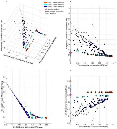 ; comfort level), a representation of the Pareto front on a diagram that can represent all the objectives at the same time is useful. By analyzing this diagram, an optimized strategy for the specific building may be defined. In