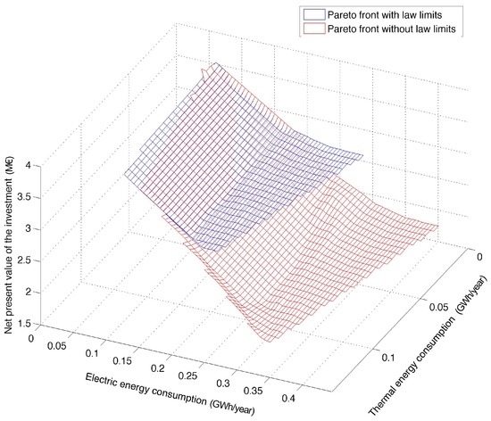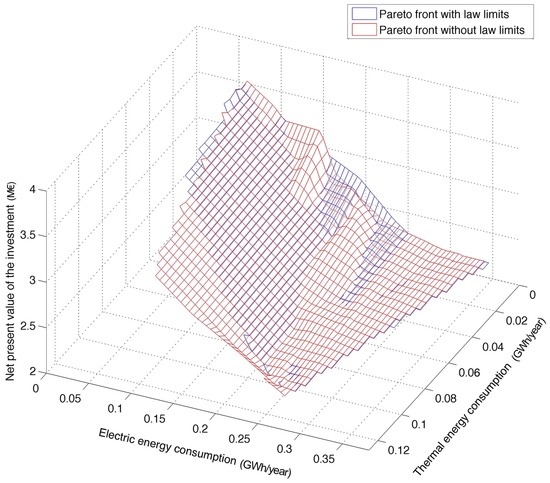 Figure 3, the simulations with and without those limits are shown. It can be observed that imposing legal limits slightly modify the Pareto front, thus legal limits are well defined for the case study. This conclusion is not trivial because the limits imposed by the Law do not consider the characteristics of the building and of the site. For example, Equation (