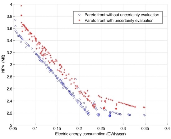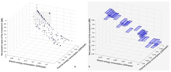 Figure 6a , three objectives (thermal energy consumption; electric energy consumption; Net Present Value of the investment) are represented: each side of the parallelepipeds represents the standard deviation of the three variables.
