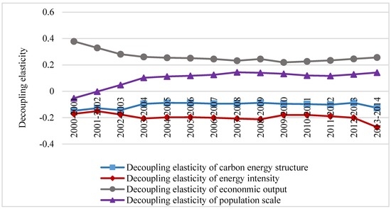 - The decoupling elasticity coefficients of carbon energy structure were negative and have strong decoupling. Before 2006, the absolute values of carbon energy structure were reduced annually, and the absolute value was on the increasing trend after 2006. This is because of the economic policies implemented by the Chinese government to adjust the industry’s structure in order to stimulate economic growth rapidly. Therefore, the absolute values of elastic index of carbon energy structure were increased, but then declined until 2013.