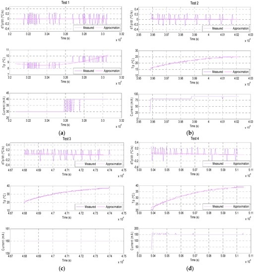 Quasi-stationary measurements performed on 2 February 2010 of electric current and cell temperature in one test is showed in Figure 4. The legend denoted “measured” is the irradiance measured by an independent calibrated sensor and the legend denoted “approximation” (corrected signal) refers to the irradiance calculated using the developed model. The natural irradiance suffers very little changes since each test lasts 10 min. The rate of temperature change can also be observed, obtained by differentiating the cell temperature.