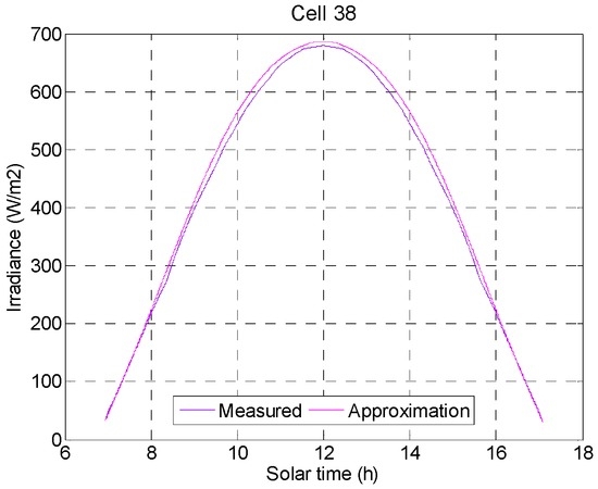 Finally, to check the effectiveness of the developed model, Equation (4) is used to estimate the irradiance in continuous tests using the temperature and intensity of the cell and the relative humidity and ambient temperature as inputs. Figure 6 shows the results obtained with continuous real measurements obtained for one cell in a test performed on 18 February 2009.