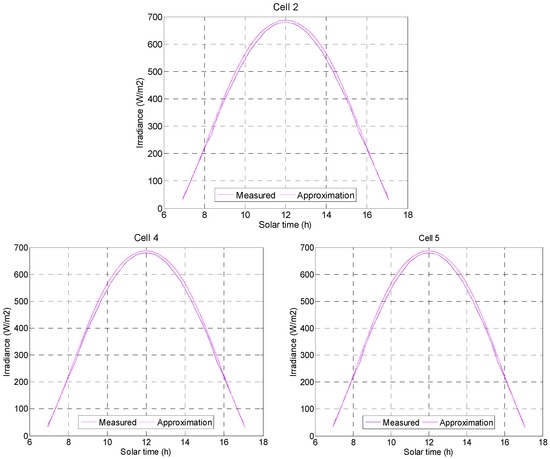 The previously-described procedure was repeated completely with all solar radiation sensors, 31 devices in total. The results obtained with three of these cells are shown in Figure 7 where it can be observed that the fitting results are similar to those obtained previously.