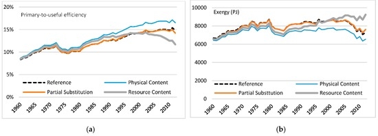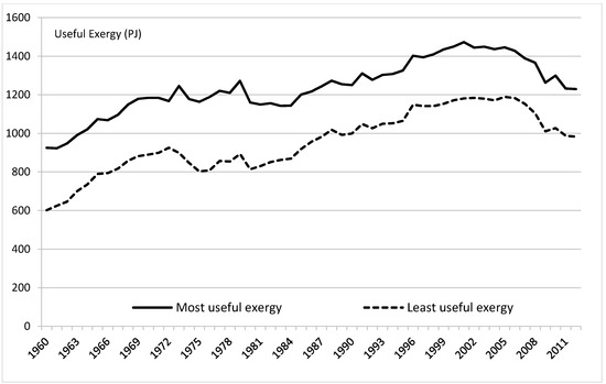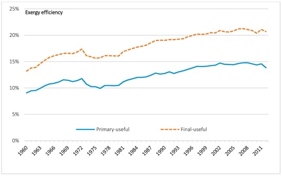 There is a growing literature on the provision of “useful exergy” within society and its relationship with economic activity. National “exergy accounting” studies have two primary advantages when accounting for energy use at the societal level. First, exergy is a measure of the capacity of an energy flow to perform physical work and hence may better represent the economic value of energy flows than measures that do not adjust for energy quality [1]. Second, the energy–economy literature commonly focuses on the “primary” or “final” stages of energy consumption [2,3,4,5], and therefore fails to capture the significant losses in subsequent conversion stages, as well as the improvements in energy efficiency over time. Exergy accounting attempts to estimate the size and dynamics of exergy flows along the conversion chain, including the magnitude and location of these losses. Hence, national exergy accounting allows for the estimation of the “useful exergy consumption” of a national economy.
