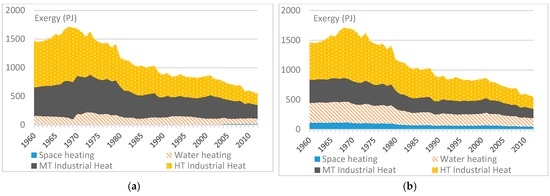 The most developed allocation method is based upon the IEA Balances [23]. For combustible fuels, final exergy data for a given energy carrier within a given sector is allocated to a specific end-use (see Supplementary Materials S3 for a full allocation list). This is often straightforward, e.g., gasoline use within the “road” subsector of transport. Allocating final exergy to heating end-uses—disaggregated into high, medium and low temperature ranges—is more challenging, particularly in the case of industrial heat. The allocation method previously used a best estimate of heat end-uses in industry sub-sectors [12,23]. We improve upon this using an empirically constructed heat map for European industry [31,32], which estimates the proportion of final energy for low (<100 °C), medium (100–400 °C) and high (>400 °C) temperature heat in each subsector of industry. We further subdivide the low-temperature category into space heating and water heating (see Supplementary Materials S4 for detail). As shown in Figure 3, this has the effect of increasing the relative share of the lower temperature categories in industrial heating final exergy.