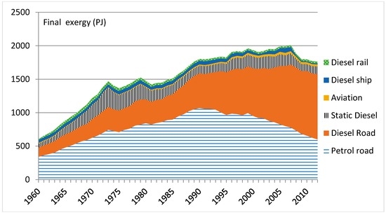 This “loss factor” method represents the efficiency of the conversion device only: that is, the efficiency of the engine and drive train up to the point of contact between wheels and road. Subsequent losses, through aerodynamic and rolling resistance, are due to the design of the passive system (e.g., aerodynamic profile and weight). Applications of the method incorporate changes in the average compression ratio over time, but hold the loss factors fixed at levels that applied several decades ago [39]. Moreover, there are issues in extending this method to other types of mechanical drive end-use (e.g., diesel road, aviation and marine), for which data is even more limited. For these end-uses, exergy efficiencies are usually taken from estimates in previous studies, e.g., references [40,41].
