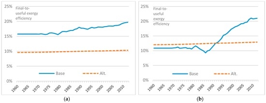 The combined effect of the mechanical drive assumptions is illustrated in Figure 7a,b. In 2012, the useful exergy consumption for mechanical drives is estimated to be 49% larger using the base methods than under the alternative methods, leading to a difference of 2 percentage points in the estimated final-to-useful exergy efficiency of the UK.
