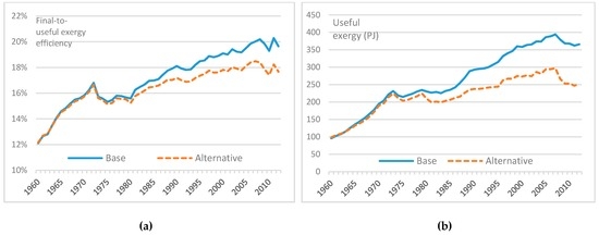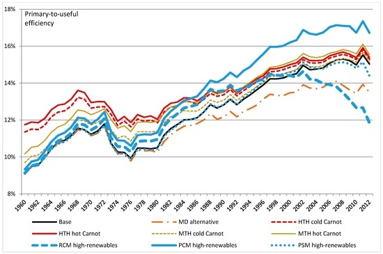 The effects of changing assumptions upon estimates of aggregate useful exergy and national-level exergy efficiency are illustrated in Figure 13, Figure 14 and Figure 15.