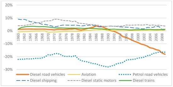 Estimates of exergy efficiency for the petrol and diesel road end-uses using each method are shown in Figure 6a,b, respectively. Estimates of end-use exergy efficiency vary more over time when using the base method (“mpg proxy”) than when using the alternative method (“loss factors”). This is particularly the case for diesel road vehicles; using the base method there is a sharp increase witnessed in exergy efficiency from 1986 onwards. These results are aggregated for all diesel road vehicles because of difficulties in separating UK data on automobile mileage between petrol and diesel cars—we have approximated this split based upon energy use. Thus the rapid growth in diesel efficiency in Figure 6b is explained by the aggregation of diesel automobiles, vans, and heavy goods vehicles: Diesel automobiles entered the market at scale only from the late 1980s, thus their higher fuel economies relative to goods vehicles lifted the aggregate end-use service (and thus exergy) efficiency of this end-use. The “loss factors” alternative method, which also does not disaggregate diesel vehicles, fails to capture these market dynamics.