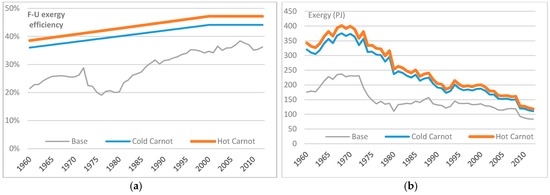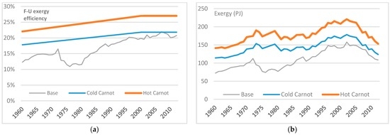 For the MTH end-use, results are sensitive both to the choice of method and the process temperature under the Carnot method. This is illustrated by the greater variability in results indicated in Figure 10a,b. The efficiency (and thus useful exergy) when using the “hot” Carnot method ranges from 1.8 to 2.2 times higher than when using the base method throughout the period, whilst between the cold Carnot and base methods, this factor is between 1.00 and 1.78.
