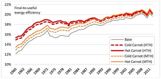 where Tc is the temperature of the cold “waste” reservoir and Th that of the desired process (both measured in Kelvin). Serrenho et al. [24] use this “Carnot method” to estimate the exergy efficiency of all heating end-uses, whilst Brockway et al. [12], Ayres et al. [40] and Ayres and Warr [41] use it only for low-temperature processes (space and water heating). Each variable on the right-hand side of Equation (6) gives rise to a separate source of uncertainty; these affect the uncertainty in ε differently for different end-uses. For example, for space heating, Th and Tc—indoor and outdoor temperatures, respectively—can be estimated with some degree of confidence, given that accurate time series data for both of these variables are available (e.g., time series of average domestic temperature [43]). Hence, the estimated time series of η is likely to be the primary source of uncertainty in this instance. We return to this point in Section 4.2.