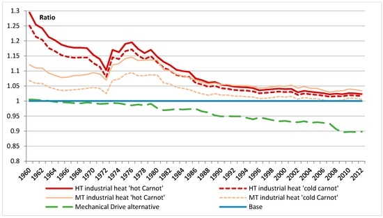 Figure 13 shows national useful exergy consumption when using each alternative approach to end-use efficiency estimation, as a proportion of “base method useful exergy” (such that the base methods line is unity throughout the period). It shows that the method by which high-temperature industrial heat efficiency is estimated has the strongest effect on useful exergy in the early part of the time period; in 1960, the hot Carnot method estimate is 1.3 times larger than that of the base methods. Differences in the method used to estimate the efficiency of medium-temperature industrial heat and mechanical drive end-uses become significant later in the period as these come to represent an increasing proportion of final exergy.