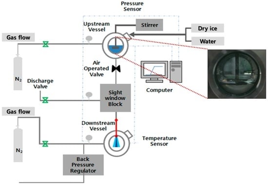 A saturated mixture of CO2 was achieved by adjusting the temperature and mass of solid CO2 (SCO2). Different chamber temperatures were achieved with the use of a constant-temperature bath. As shown in Figure 1, the nozzle was installed between the middle block and the downstream chamber. It was 300 mm long with an internal diameter of 0.4 mm. Two different materials were used for the nozzles. Some were made of transparent Pyrex, enabling the visualization of the flow pattern inside the nozzle. This was useful for examining either capillary action or flash-boiling behavior. However, a copper nozzle was used for purposes other than internal visualization. A data-acquisition system was utilized to monitor the temperature and pressure inside the chambers, and a flow controller unit was used to turn the valves on and off pneumatically.