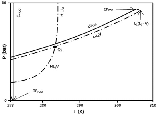 Figure 2 illustrates a schematic p-T diagram of the global multiphase behavior of carbon dioxide-water between 273 and 310 K as can be determined from the literature data [,]. In the figure, three-phase line connects all p, T coordinates where two liquid phases (a water-rich liquid L1 and a carbon dioxide-rich liquid L2) coexist with a carbon dioxide-rich vapor V. The pressure at L1L2V equilibrium is close to two-phase line, the liquid and vapor curve of pure CO2, but always below the vapor pressure of pure CO2. Because of this similarity of the three-phase line and two-phase line at tested ranges of pressure and temperature (25 °C), pressure release from 85 to 60 bar has higher presence of CO2-rich liquid(L2) than CO2-rich vapor(V) since it is located well over the three-phase equilibrium line. In contrast, pressure release from 65 to 40 bar experiences a phase transition from the CO2-rich liquid(L2) to the CO2-rich vapor(V) phase. The detailed properties of the two pure components, water and LCO2, are listed in Table 1.