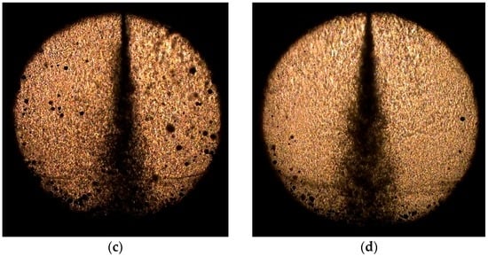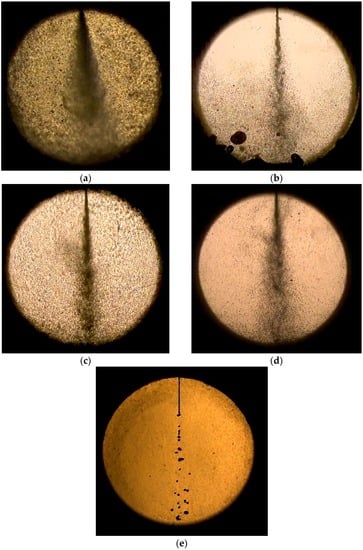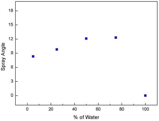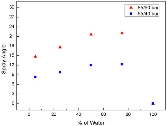The spray characteristics were observed for a higher injection pressure of 85/60 bar. Figure 6 shows the effect of the water-blending ratio of the water-CO2 mixture on the spray angle at 85/60 bar. The variation of the spray angle with respect to the water fraction as the water content increased was similar to that at 65/40 bar. However, the angle was 15°–21°, which is far larger than that at 65/40 bar. This can be explained by the reduced evolution of gaseous CO2 in the water droplet. Dissolved CO2 has a higher pressure than vapor pressure at the temperature of 25 °C and is likely to remain a liquid. Therefore, the addition of liquid CO2 provides less viscosity for the mixture than for water, where the velocity and thus the momentum increase. This can increase the spray angle despite the lower amount of flash boiling. The presence of liquid in the jet was also important for the use of carbon dioxide in cutting applications []. While jets containing only gas and liquid showed almost no effect on the selected samples, the impact increased dramatically with the presence of liquid.