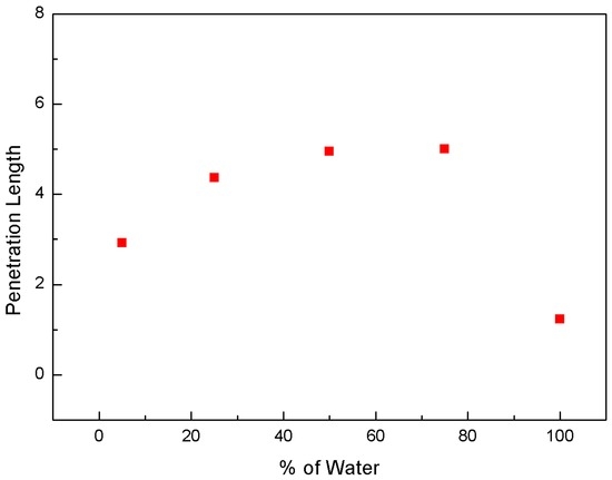 Figure 4 and Figure 5 show the change in the spray angle and penetration length, respectively, according to the water fraction. The information was derived from the images of Figure 3. In the spray image, two lines are drawn and intersected at the nozzle tip. The angle between two lines is carefully measured for spray angle. We identified horizontal line of spray tip normal to vertical line and measured distance from nozzle tip to this line. This is used for penetration length. The data at a water content of zero are excluded in these plots. As the water content increased, the spray angle and penetration length increased to 75 wt % and then decreased. At 75% water blend condition, higher penetration length and angle were observed, indicating a higher degree of flash spray. In the case of higher flash spray, droplet size becomes smaller and more uniform. Therefore, droplet evaporates quickly and particle would agglomerate less. Based on this observation, a water content of 75 wt % appears to be optimal for the effective transport of coal particles by improving the spray quality.