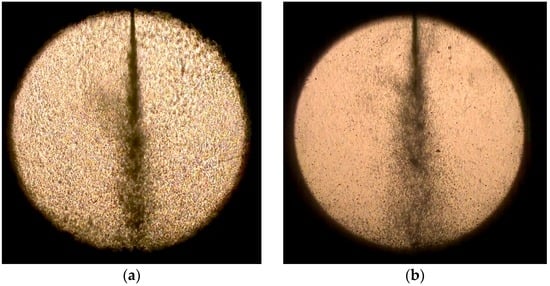 In a previous work [], spray patterns under three different levels of upstream pressure (pressure difference) were observed using a high-speed camera: 65/40, 75/50, and 85/60 bar. At 65/40 bar, the internal flashing due to bubble formation caused a wider spray angle and shallower penetration length among three sprays. This is sometimes called a “bowl spray” and involves a high level of flash-atomization, which is an effective breakup mechanism of the liquid column, due to a burst of bubbles. A phenomenon similar to the bowl spray was observed with an increasing degree of superheat by Lin et al. [] and Park et al. []. In contrast, a narrower spray angle and deeper penetration were observed at 85/60 bar, where the flash boiling is absent because of the liquid abundance. This is considered a normal jet spray. This difference is caused by the higher velocity of the liquid flow inside the nozzle orifice.