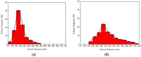 Figure 8 shows the dependence of the distribution of the liquid-droplet size on the degree of flash boiling. A conventional image-analysis technique was employed to obtain the droplet-size distribution. The results show that the mean diameter of the liquid spray at 65/40 bar was 150 μm. However, the higher pressure of 85/60 bar yielded a larger droplet of 300 μm with a larger deviation from the mean diameter. A similar trend in the droplet-size distribution was observed by Xiao et al. [], who demonstrated that the addition of CO2 in diesel spray produced a far more uniform droplet size because of the flash separation of CO2 from the liquid. The finer and more uniform droplet confirms the strong flash atomization of the spray at 65/40 bar. This condition is favorable, as small liquid droplets may evaporate quickly and thereby prevent coal agglomeration when coal is present []. The size distribution was measured using the open source software ImageJ. The threshold was appropriately chosen to identify the droplet particle from the background. Then, a measuring tool was used to calculate the size of multiple droplets automatically. It is instructive to note the limitations of the shadowgraph technique. Smaller droplets scatter away much less light than large droplets. Therefore, the smallest droplets in the spray are not detectable with current shadowgraph technique. However, this effect may not be significant when determining any difference in injection pressure since it is present at both pressure conditions.