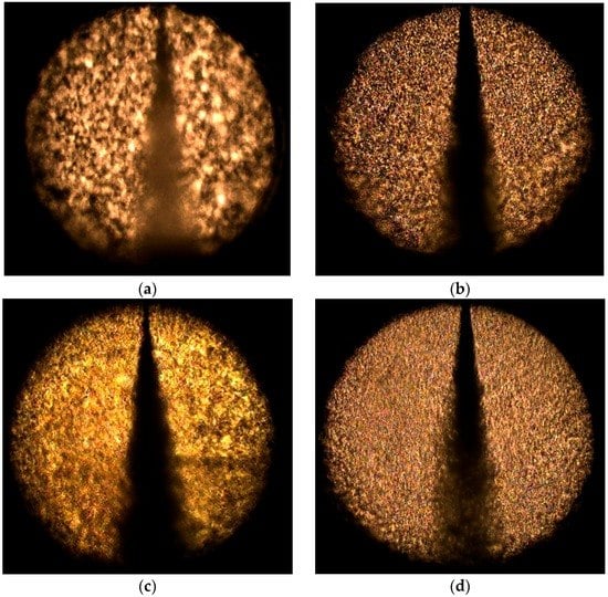 Figure 9 shows a series of spray events of LCO2-water mixture at different chamber pressures. As the chamber pressure increased at the same injection pressure, the flow rate decreased, which reduced the spray angle as well as the penetration length. This phenomenon was observed in the visualization results of Jakobs et al. [] and Johnson et al. []. The spray angle as a function of the chamber pressure has been measured for values between 1 and 20 bar []. An increase in the chamber pressure from 1 to 20 bar results in a decrease in the water-spray angle from 36° to 24°. An increased chamber pressure appeared to contract the spray, yielding a more dense cloud of droplets compared with the corresponding atmospheric case. This was explained by the smaller volume of the entrained air due to the increased pressure. This tendency matches the diesel spray reported in [].