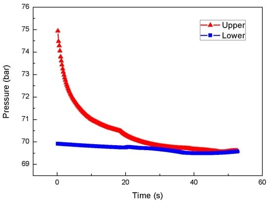 Figure 10 shows the temporal variation of two different pressures between the chambers during the throttling process. One is the upstream pressure (injection pressure), and the other is the downstream pressure (chamber pressure). The chamber pressure remained constant, indicating the proper operation of the back-pressure regulator. The injection pressure in the upper chamber experienced a continuous and smooth decay during the throttling process.