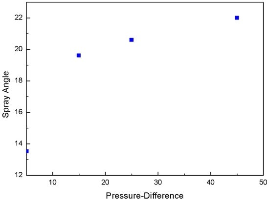 Figure 11 plots the spray angle against the pressure difference. When the chamber pressure is high, the pressure difference is low, which indicates a reduced flow rate. The spray angle remains low at 13.5°. However, when the chamber pressure decreases, i.e., the pressure difference increases, the angle is increased to 20° and afterwards it is not changed substantially. The latter is attributed to choke flow, where vapor is prevalent in the mixture and therefore the flow rate is limited.