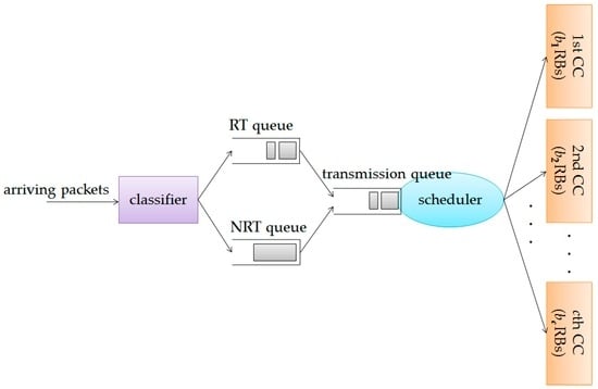 The proposed system model, which consists of a classifier, a real-time (RT) queue, a non-RT (NRT) queue, a transmission queue, a scheduler, and c component carriers (CCs) with the ith CC containing bi resource blocks (RBs), where i = 1, 2, …, c, for downlink transmission.