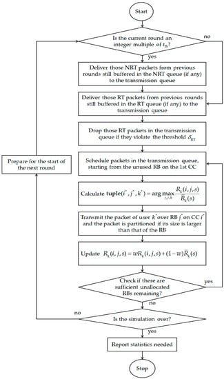 For the purpose of ensuring that the required QoS for the RT traffic is maintained, we set the ratio of , which consists of the number of RBs that the NRT users can share, to , at a specified level ; i.e., , where . It should be noted that the selection of those RBs (i.e., the RBs) begins with the RB on the CC with the index i = 1 and then proceeds in sequence. More precisely, all the RT packets can be transmitted over RBs, whereas the NRT packets can only be transmitted over RBs. Consequently, the NRT packets are scheduled on the basis of the PF criterion only with regard to the RBs available; however, for RT packets, RBs are available. In other words, RBs are always kept in reserve exclusively for all the RT packets. As a result, the ability of all the RT packets to be transmitted can be protected to some extent when the system is faced with an excess amount of NRT packets.