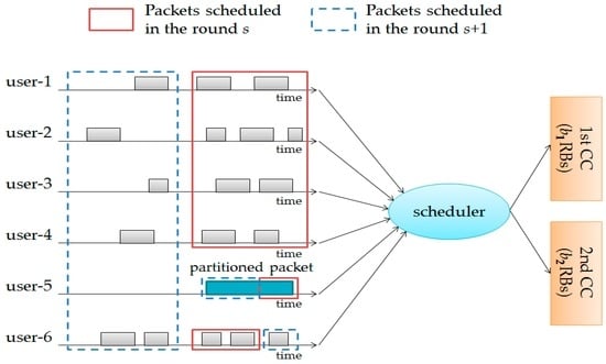Figure 3 shows a typical transmission scenario for the algorithm in a case of a partitioned packet; more specifically, the illustrated case involves six users and two CCs aggregated in a BS. It is assumed that . It is then further assumed that user-5 is an NRT user, while the other users are RT users. Thus, according to our definition, only the 1st CC can be used by user-5 for transmission, whereas the RT users can use both CCs for parallel transmissions. However, since the size of the packet for user-5 is larger than that of the considered RB, it is partitioned during its first transmission. The remaining portion of this packet is then provided a RB for transmission during the next round. It should be noted that all those packets scheduled in the current round illustrated in Figure 3 would have already been buffered in the transmission queue illustrated in Figure 1.