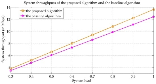 Comparison between the proposed algorithm and the baseline algorithm for the system throughput versus the system load.
