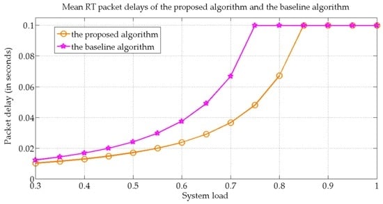 Furthermore, Figure 5 also shows that there was no monotonic increase in the mean RT packet delay for either the proposed algorithm or the baseline algorithm. Rather, for high system loads, the maximum of the mean RT packet delay was always equal to 0.1 s because the RT packet would be dropped if it violated the threshold of = 20 rounds (i.e., 0.1 s).