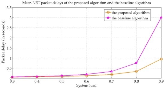 Comparison between the proposed algorithm and the baseline algorithm for the mean NRT packet delay versus the system load.