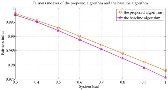 In Figure 7, a plot of the fairness index versus the system load is shown. As can be seen, since both the proposed algorithm and the baseline algorithm were designed on the basis of PF, the fairness indexes for both were high. However, the fairness index provided by the baseline algorithm was still slightly lower than that provided by the proposed algorithm. This was presumably because, with the proposed algorithm, each RT user could use all the resources made available by the aggregation of two CCs for transmission, whereas they could only use a single CC under the independent CC mechanism used by the baseline algorithm. In other words, with the independent CC mechanism, the probability of a delay violation with respect to was higher, which in turn indicated that the variation in was larger. As a result, F was smaller. In addition, Figure 7 also indicates that the fairness indexes for both algorithms were almost equal to 1 when the system load was low.