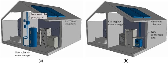 The principle of the presented retrofitted system is to reuse the existing hot water heater for solar hot water storage. The new solar collectors are connected to the existing storage by means of a recently developed connection unit containing the required balance of system (BOS) (Figure 1b). Consequently, the retrofitted solution upgrades the existing heating system instead of replacing it, which has the potential to reduce the investment cost in terms of both material and installation costs. The connection unit is designed to be non-invasively connected to an existing water heater of a conventional kind. In other words, there is no need to provide additional inlets or outlets in the hot water storage—the two available connections, inlet of cold water and outlet of hot water, are sufficient for installation of the module.