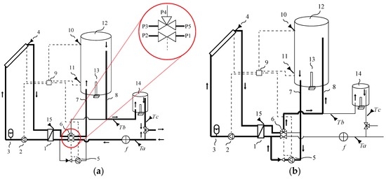 Flow schematics and monitored measuring points during: (a) domestic hot water discharge and (b) solar charge.