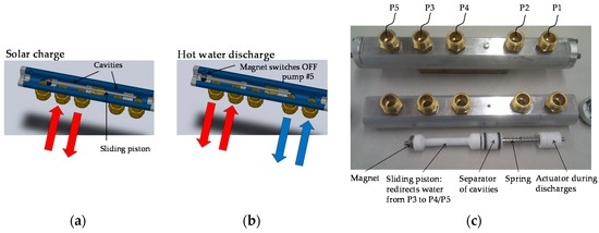 Newly developed multiport valve [27]: (a) during solar charge; (b) during hot water discharge; (c) picture of the components of the valve while dismounted.