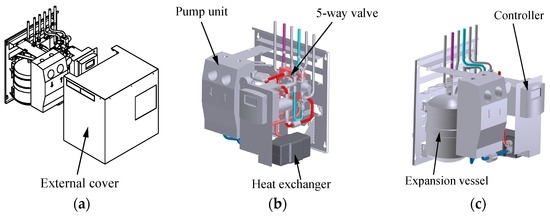 Prototype drawings of the connecting unit excluding the auxiliary heater: (a) with the external cover; (b) without the external cover in perspective; (c) without the external cover in another perspective.