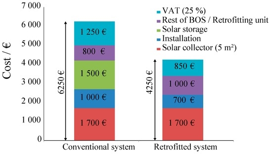 The International Energy Agency reports the investment cost for a solar domestic hot water system in Sweden, with a 5 m2 collector area and storage of 300 litres, to be approximately 5000 € excluding VAT [37]. The Swedish National Board of Housing, Building and Planning also reports on an average investment cost of a solar domestic hot water system in Sweden, including a new solar hot water storage, to be estimated at approximately 5000 € for a collector area between 4 m2 and 6 m2 [38]. In the neighbouring country of Denmark, such a system is reported to cost approximately 1100 €/m2 which would mean a total cost of about 5500 €/m2 for an entire system with 5 m2 solar collector area [12]. The total cost of a conventional solar domestic hot water system was set to 5000 € excluding VAT and 6250 € including VAT at 25%. The total cost of the retrofitted system was set to 3400 € excluding VAT and 4250 € including VAT, based on cost data from the manufacturing supplier for large volumes.