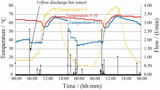 Figure 8 illustrates some of the measured temperatures and hot water discharge flow on 7 and 8 September, illustrating representative summer behaviour. During those days the incoming cold water temperature was approximately 16 °C. Once the temperature on the outlet of the solar collectors (#4), shown in yellow, was higher than that of the bottom of the tank (#11), shown in blue, the pumps started the charging process. It can be seen that stratification decreased initially, since water at a colder temperature was placed at the top. This is explained by the fact that the inlet position is placed at the top (Figure 2) while the controller compares the bottom temperature with the collector outlet temperature in order to start the pumps. At approximately 20:00 on the first day, hot water was discharged, which cools the bottom of the tank and builds up stratification. The discharge is shown in black using the right-hand vertical axis.