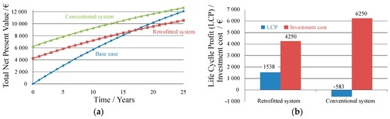 Figure 9a shows the net present value during 25 years for three cases: base case (without solar energy), shown in blue; the retrofitted solar domestic hot water system, shown in red; and the conventional solar domestic hot water system, shown in green. With the assumptions applied, the payback time of the retrofitted system is approximately 17 years while the conventional system never becomes profitable. In Figure 9b the investment cost is compared to the life cycle profit after 25 years for each of the solar thermal systems. Only the retrofitted system is expected to reach any profit.