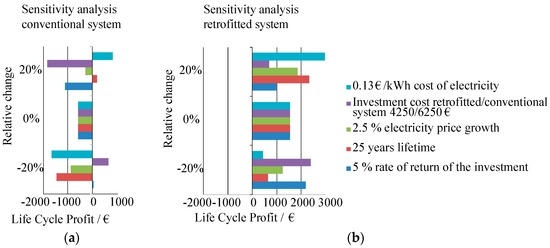Figure 10 shows a sensitivity analysis of the LCP calculations by varying some of the assumed inputs by ±20%. The analysis shows that the result of the LCP calculation for the retrofitted system is always positive, but mainly negative for the conventional system. It can also be noted that the input parameters with the strongest influence on the LCP result are the cost of electricity, investment cost and lifetime.