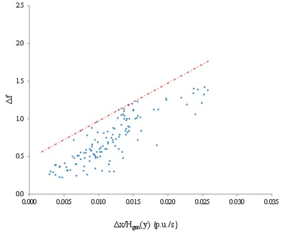 The parameters can now be determined using the linear envelope of the points contained in the figure. This envelope represents a worst case scenario from the frequency stability perspective since it corresponds to the maximum frequency deviation that the system can experience after a power imbalance . If the parameters are determined using this envelope, an upper limit for in Equation (30) is found. Then, if represents the maximum value that the frequency nadir can reach in order to prevent the activation of the UFLSS, the optimization must ensure that: