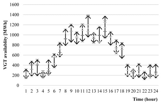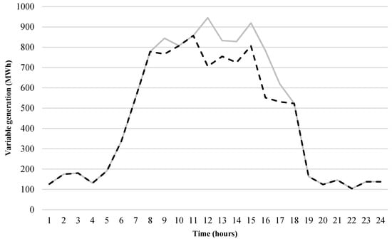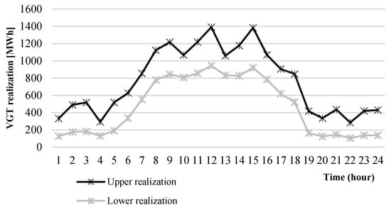 In order to evaluate the economic performance of the RUC solutions, two realizations of VGT are taken into account: an upper and a lower realization (see Figure 3). The upper (lower) realization is obtained by choosing the maximum (minimum) availability of VGT at each hour of the planning period among all scenarios considered in the UC stage (see Figure 2). For these realizations of VGT, the economic dispatches are solved considering the commitment of the generation units obtained with the RUC.