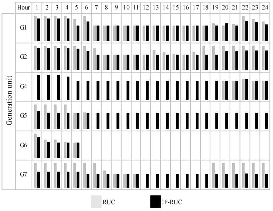 In order to see the effects of including the frequency constraints in the RUC, Figure 4 shows the power supplied by key conventional generation units at each hour of the critical day when considering both the RUC and the FC-RUC. In both cases, the lower realization for the VGT is considered. Figure 4 shows that the introduction of frequency constraints in the UC leads to a higher number of conventional units committed during the day. As a consequence, the conventional generators tend to operate at lower operation points when compared to the RUC.