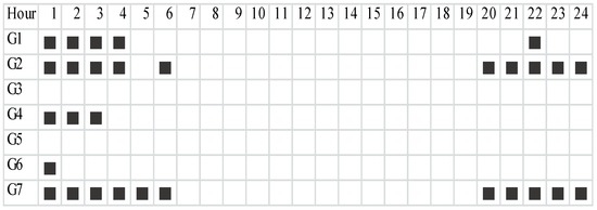 In Figure 5, the filled cells indicate the hours during the critical day at which the frequency constraints are activated. Note that the frequency constraints are activated early in the morning and late in the night. To gain a deeper insight into the relationship between the activation of the inertia constraint and the VGT, Figure 6 shows the available generation from VGT and the power actually used from these power plants. It can be seen that the availability of VGT is low during the hours when the frequency constraint is activated. This situation confirms that the system under study has frequency challenges even when the penetration level of the VGT is not significant.