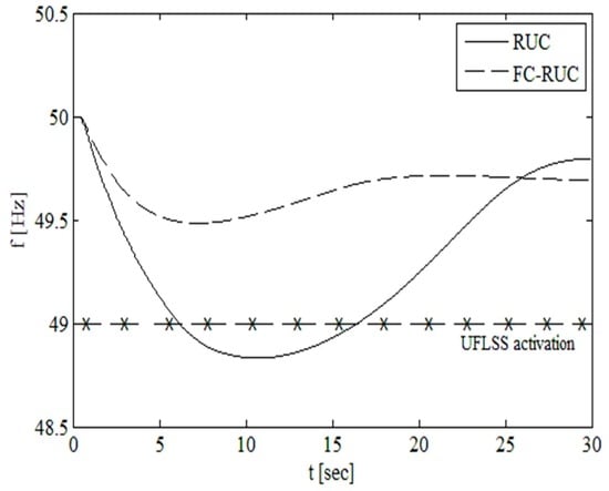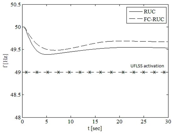 As can be seen in Figure 7, the frequency response of the system is considerably improved by including the frequency constraints in the UC formulation. The better dynamic performance due to changes in the commitment of the conventional SGs is confirmed, as can be seen from Table 5, by inspection of the initial rate of change of frequency (ROCOF) and the frequency nadir: (1) the ROCOF changes from 0.26 Hz/s in the case of the RUC to 0.17 Hz/s in the FC-RUC and (2) the frequency nadir (minimum frequency after the contingency) increases from 48.83 Hz for the RUC to 49.48 Hz in the case of the FC-RUC. The inertia constant of the system increases from 5.65 s in the case of the RUC to 14.86 in the FC-RUC. Moreover, when the frequency constraints are considered, the UFLSS are not activated. On the other hand, in the case of the RUC, two steps of UFLSS are activated, thus not supplying 27 MW of load.